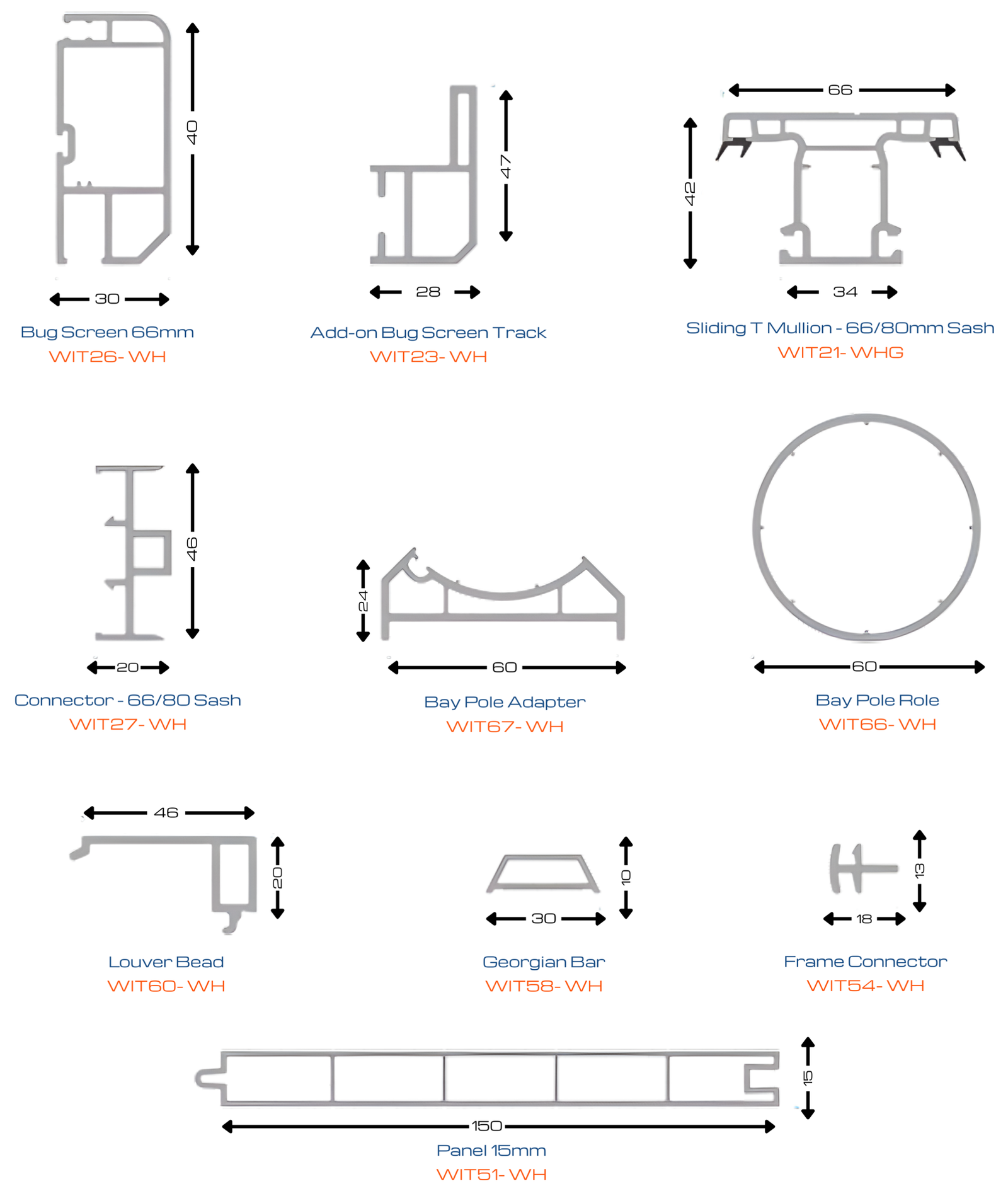 Seamless integration profiles including glazing beads, connectors, mullions, and bug screen components.